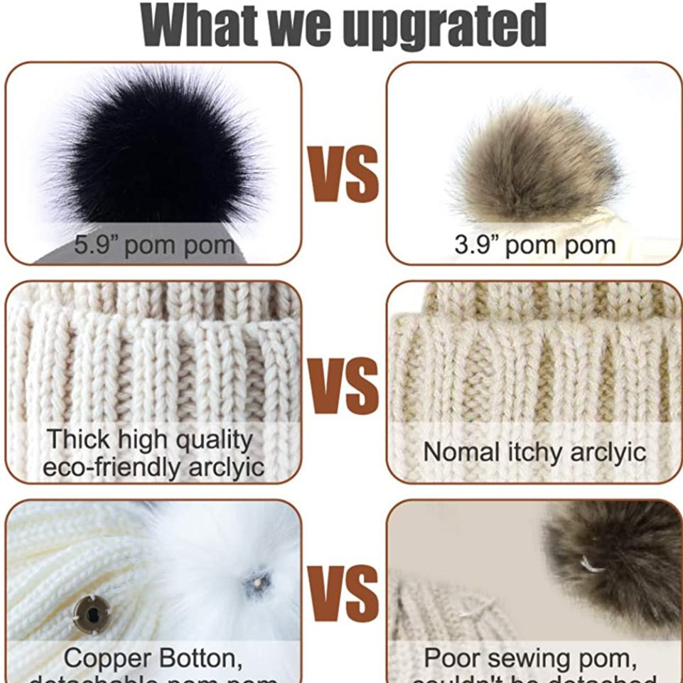 The beanie hat is made of 100% soft acrylicreef safe materials, suitable for sensitive skin with 2 high quality shiny faux racoon fur pompom different from the ordinary on the side about 3.17" from the center, which looks like two ears of the hat.